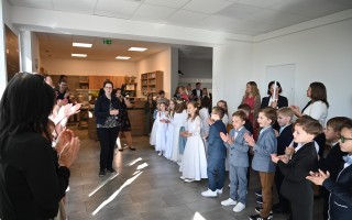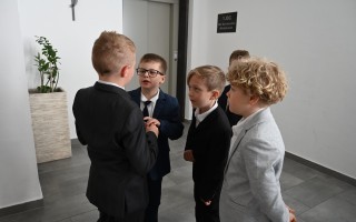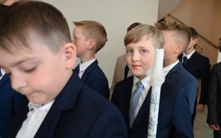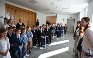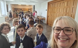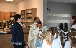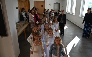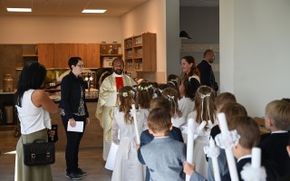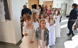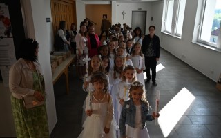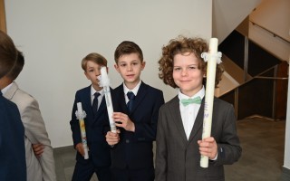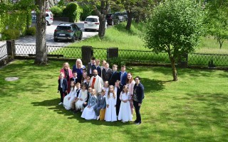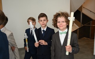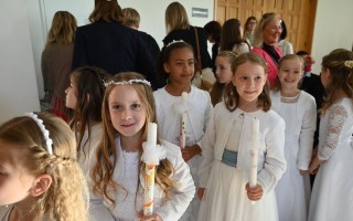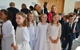 Der festliche Gottesdienst unter dem Motto "Wir sind lebendige Steine" wurde von Religionslehrerin, Frau RL Michaela Brandstetter, BEd, zusammengestellt und von Herrn Pfarrer Wilson Abraham gehalten. Um einen großen Tisch versammelt, feierten die Erstkommunikantinnen und Erstkommunikanten die Heilige Messe. Musikalisch unterstützt wurde der kräftige und schöne Gesang der Kinder von Ulrike Honeder (Gitarre), Bernadette Heilingbrunner (Querflöte), Benedikt Hochholzer (Cajon), Manfred Hochholzer (Saxophon) und Thomas Heiland (Keyboard und Orgel).