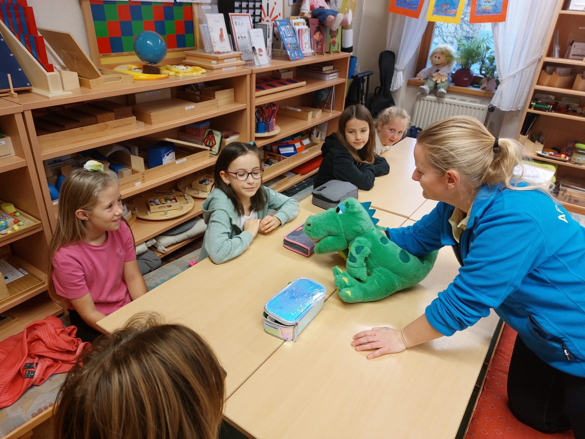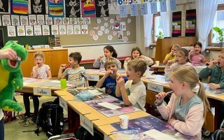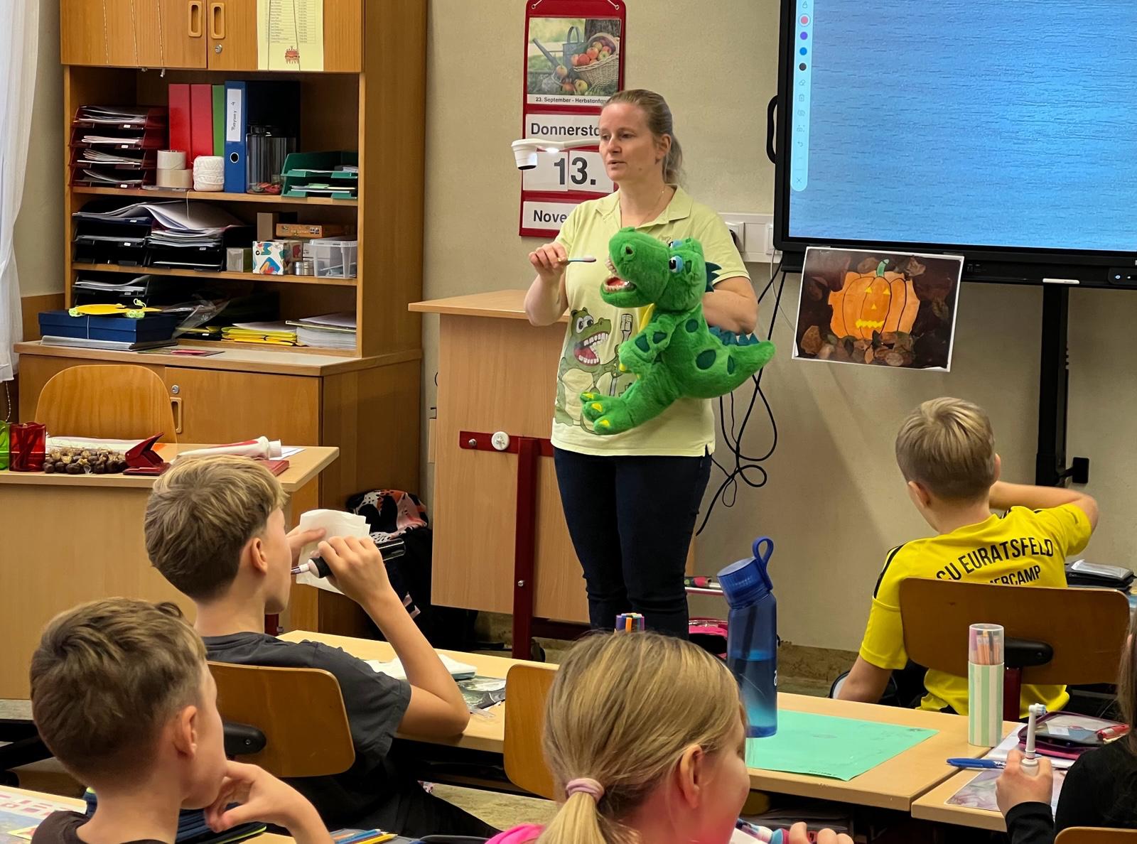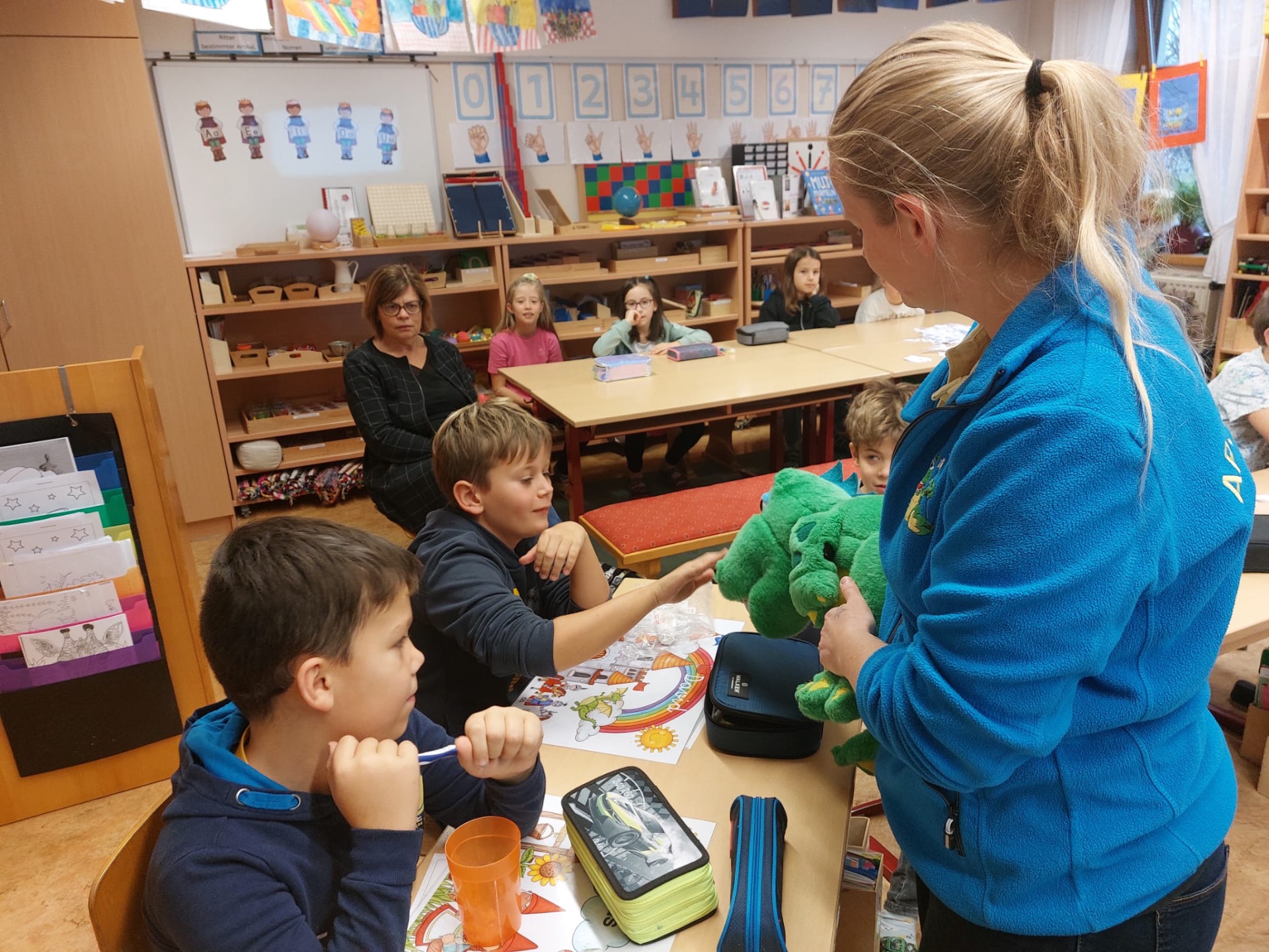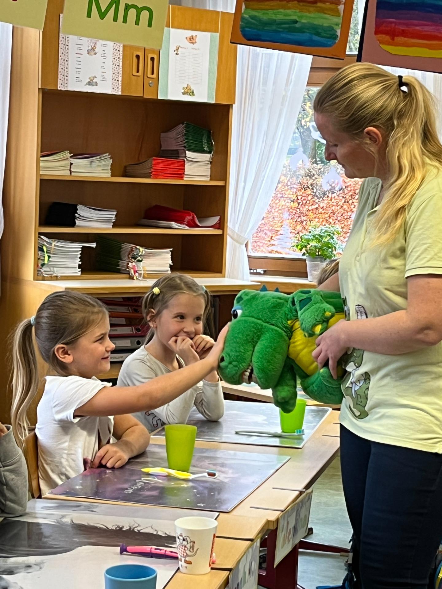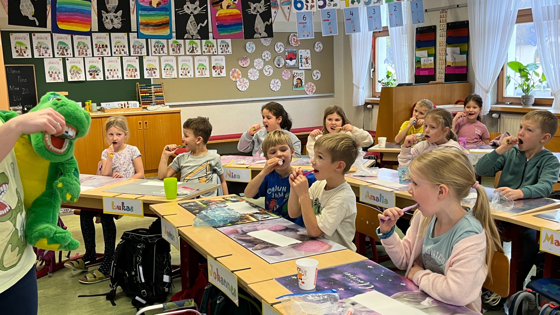 Der kleine Drache begleitet die Zahngesundheitserzieherin, Frau Manuela Bichlmayer, und versucht, den Schülerinnen und Schülern die Wichtigkeit der Zahnpflege klarzumachen.