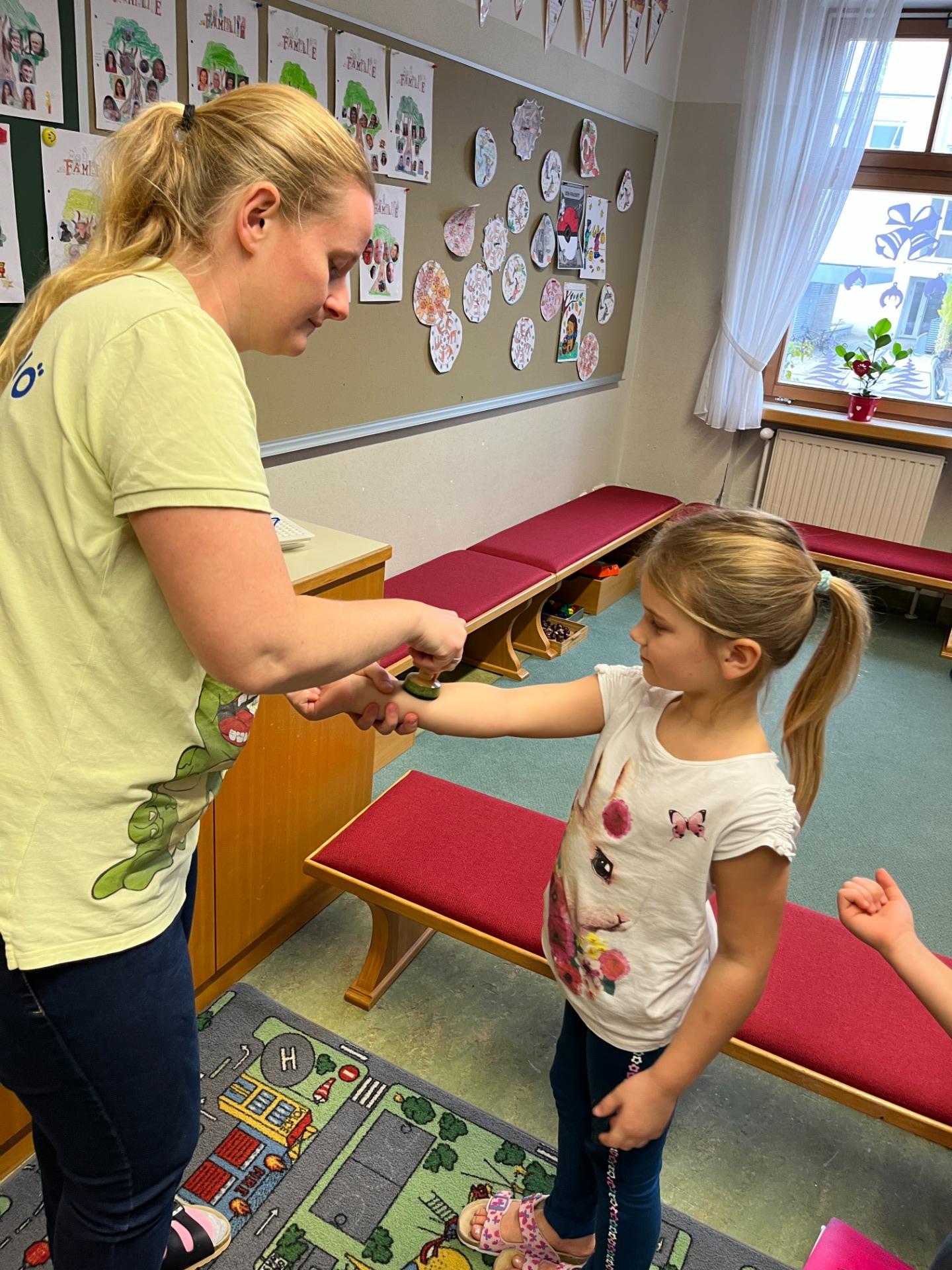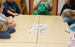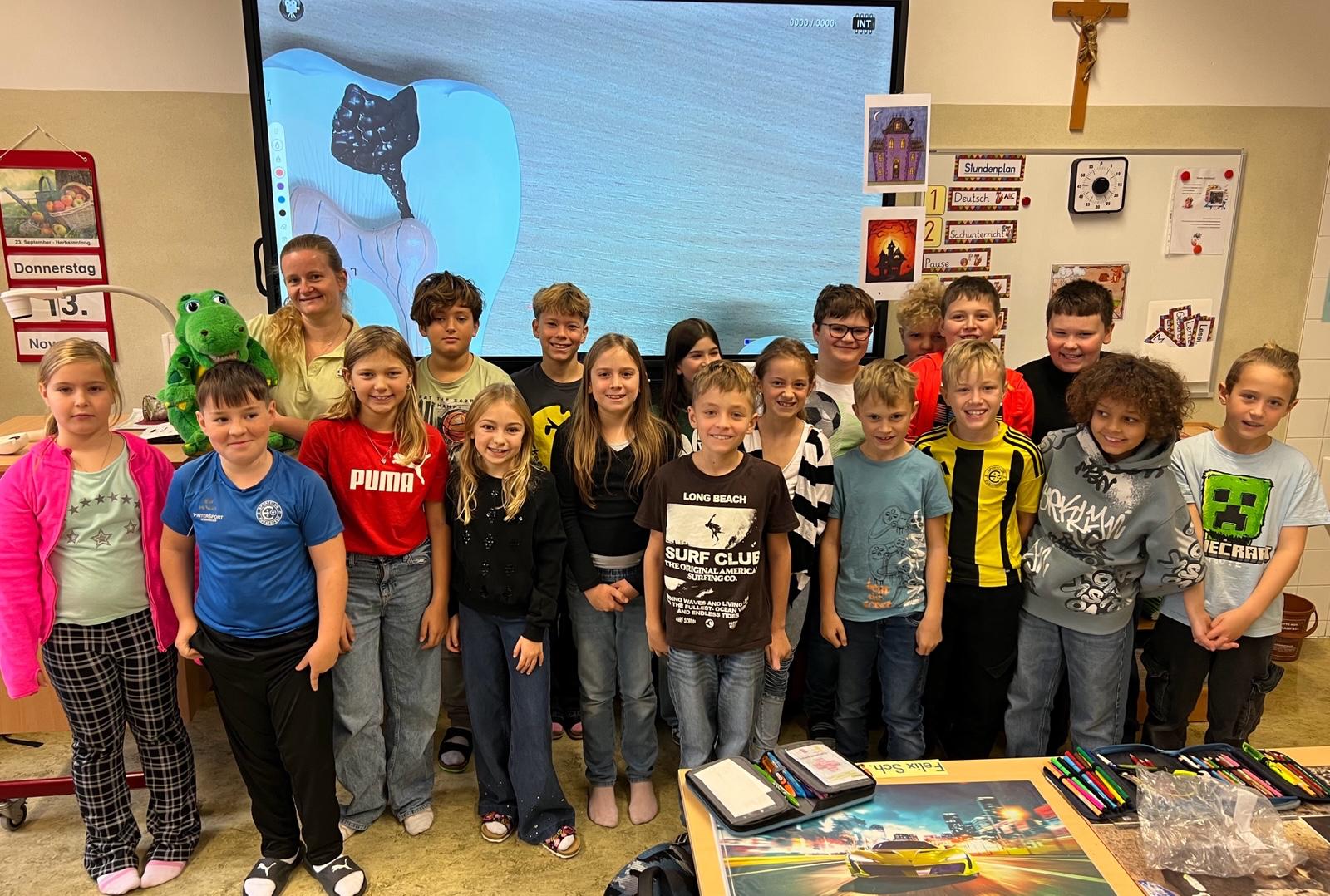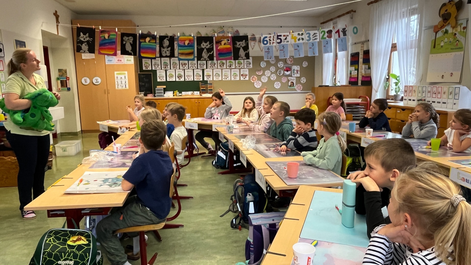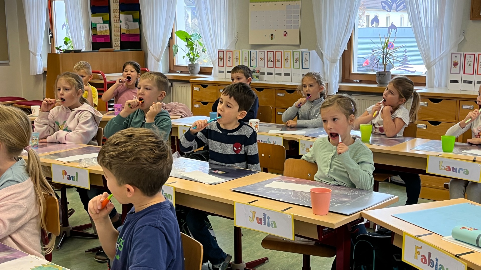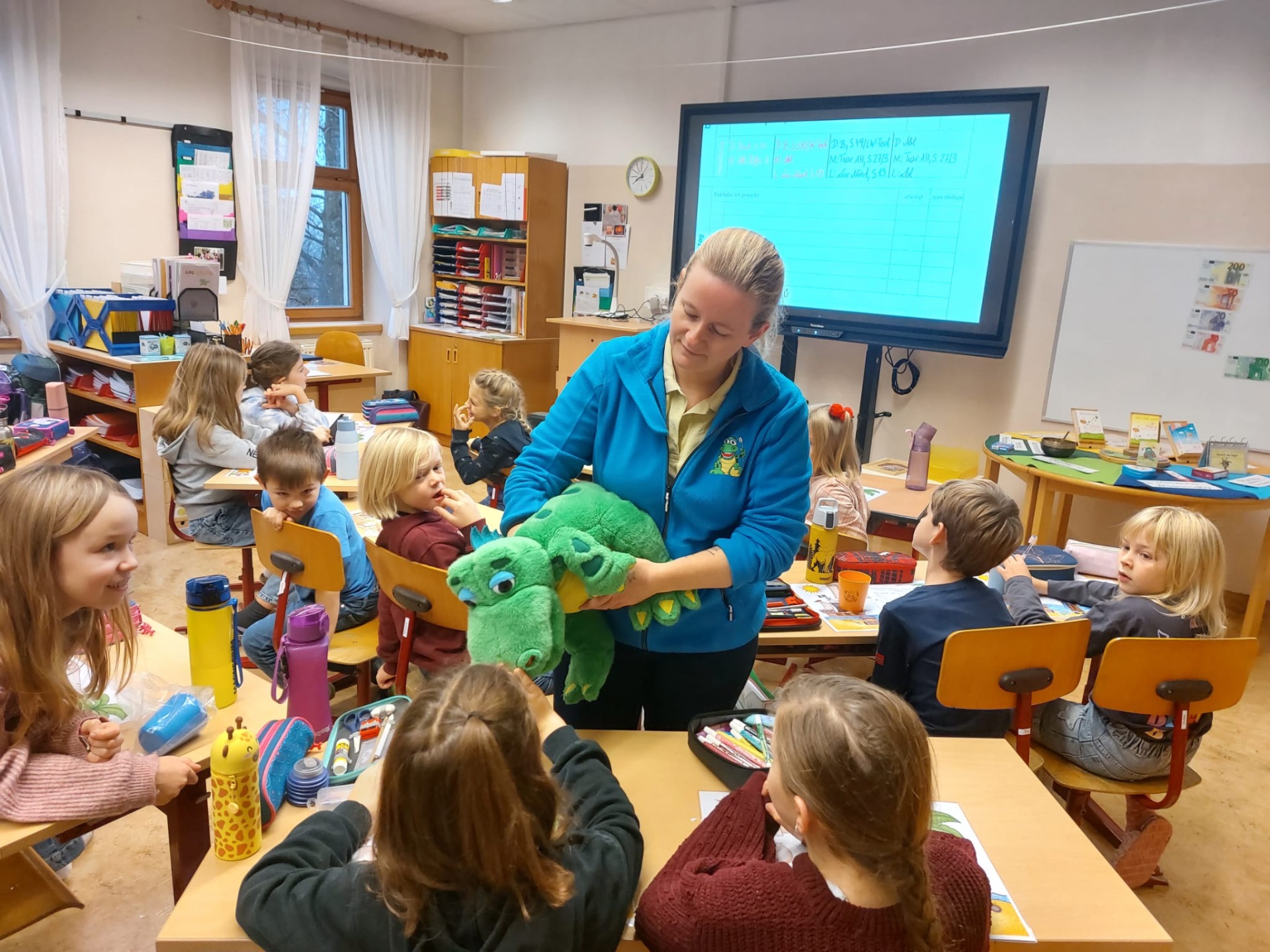Der kleine Drache begleitet die Zahngesundheitserzieherin, Frau Manuela Bichlmayer, und versucht, den Schülerinnen und Schülern die Wichtigkeit der Zahnpflege klarzumachen.
