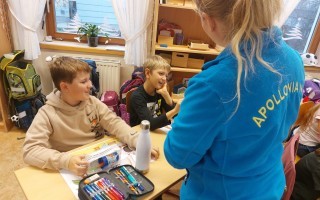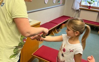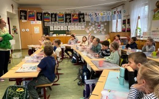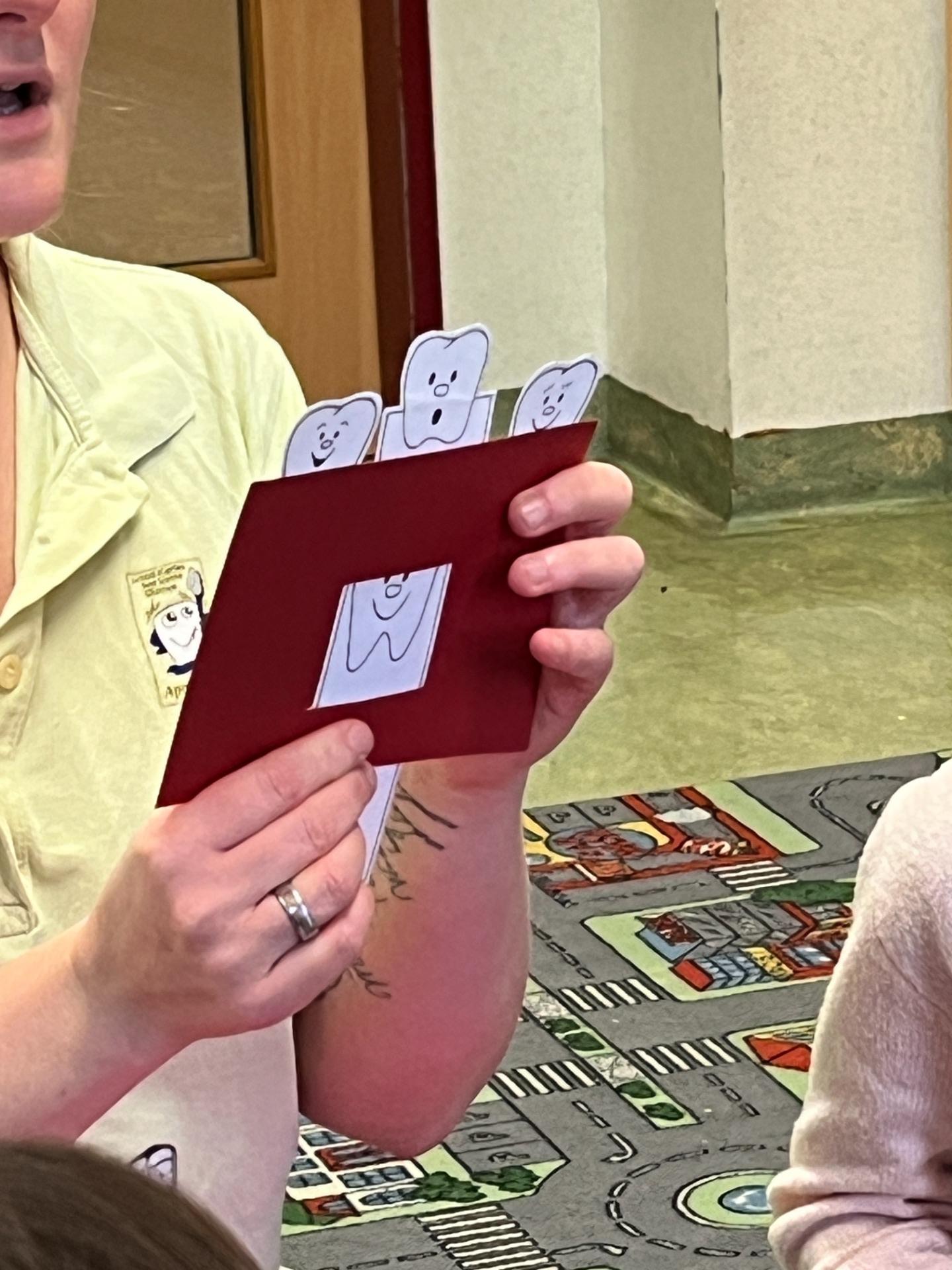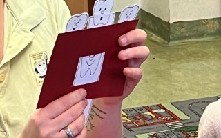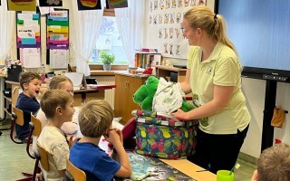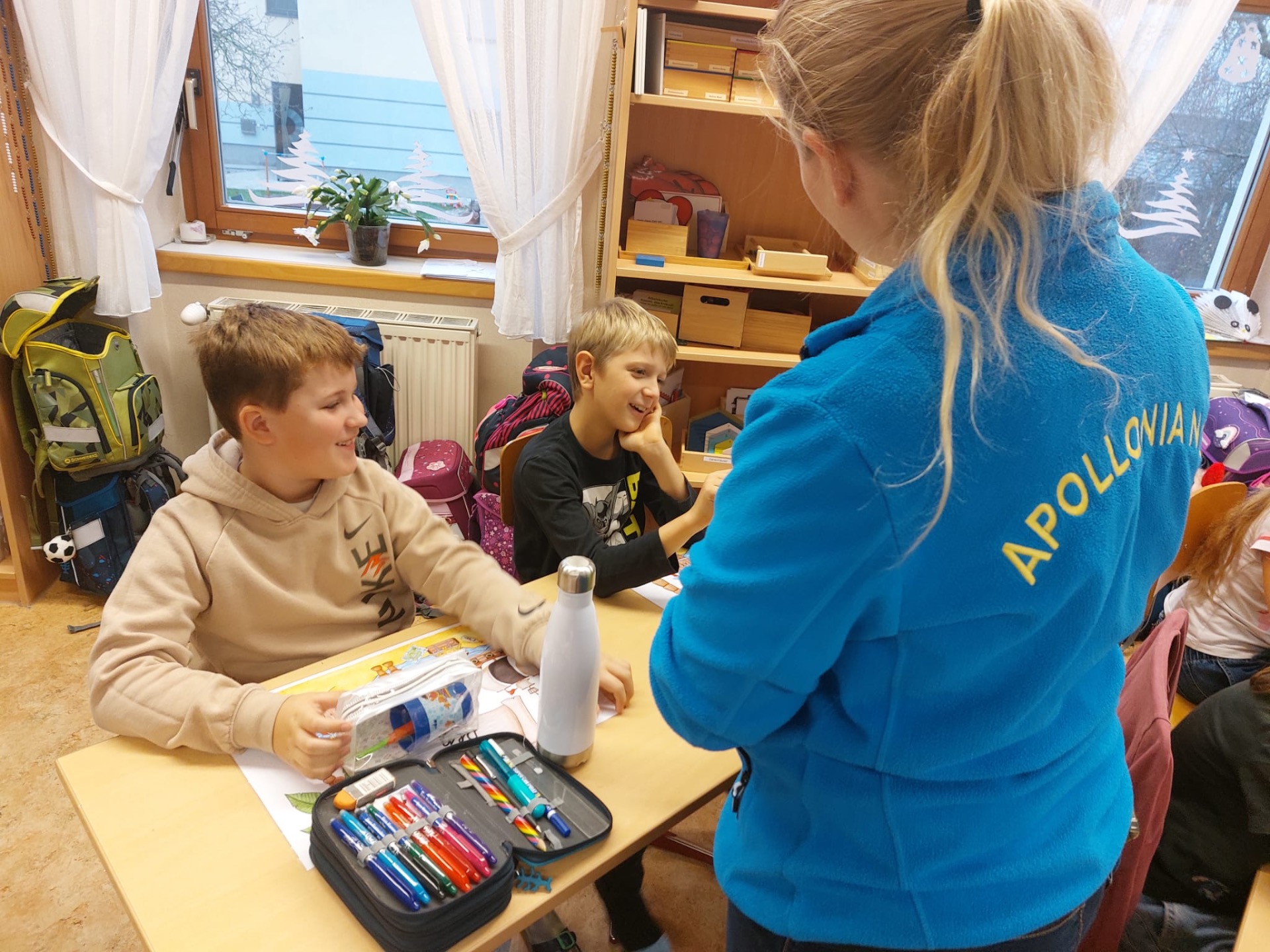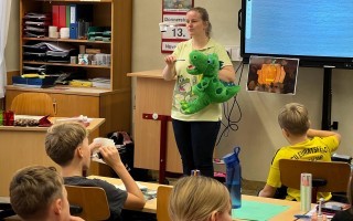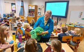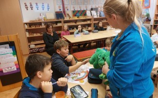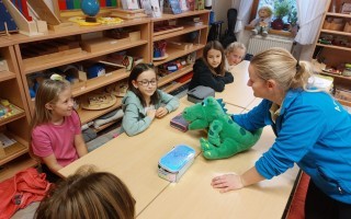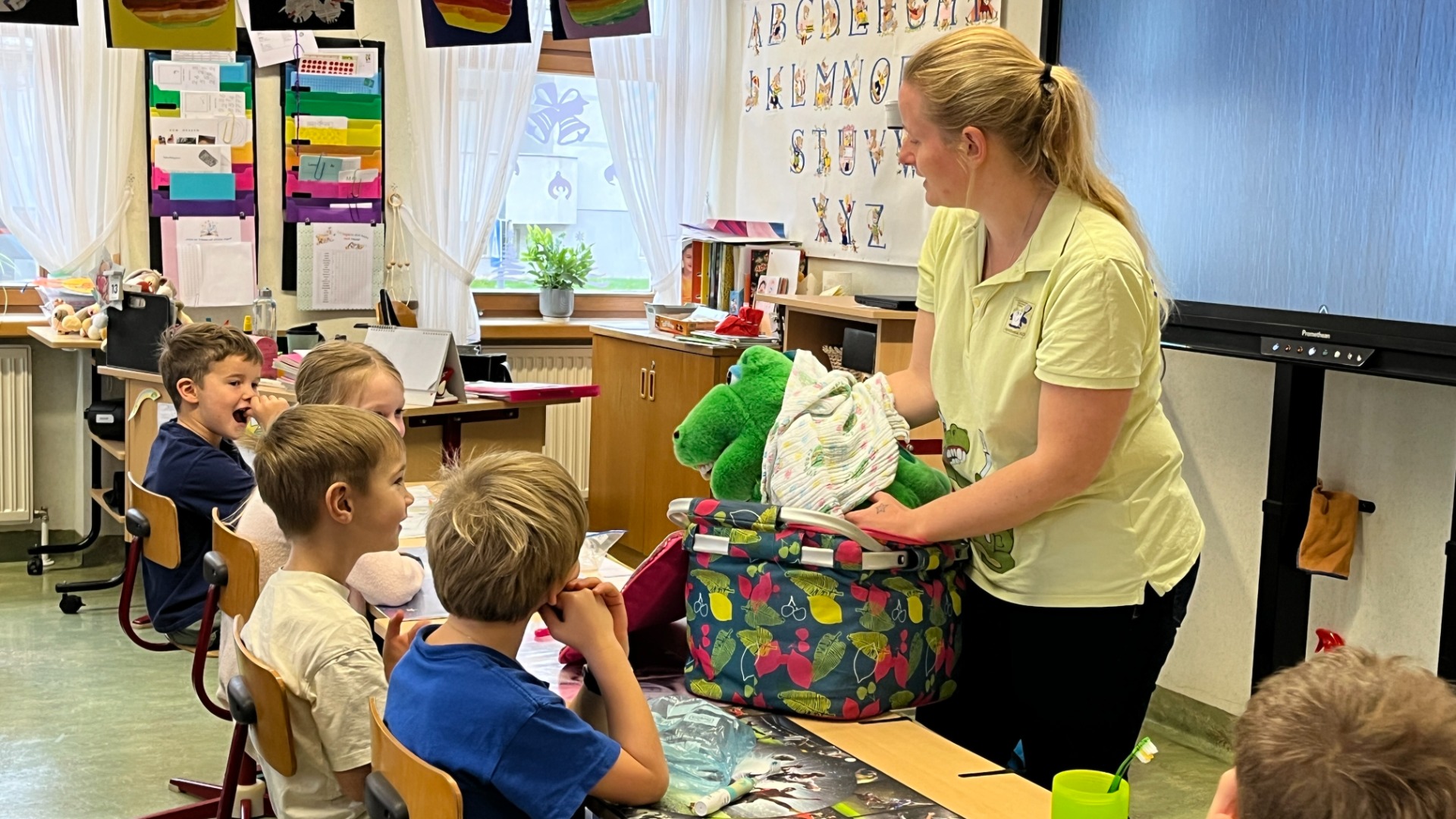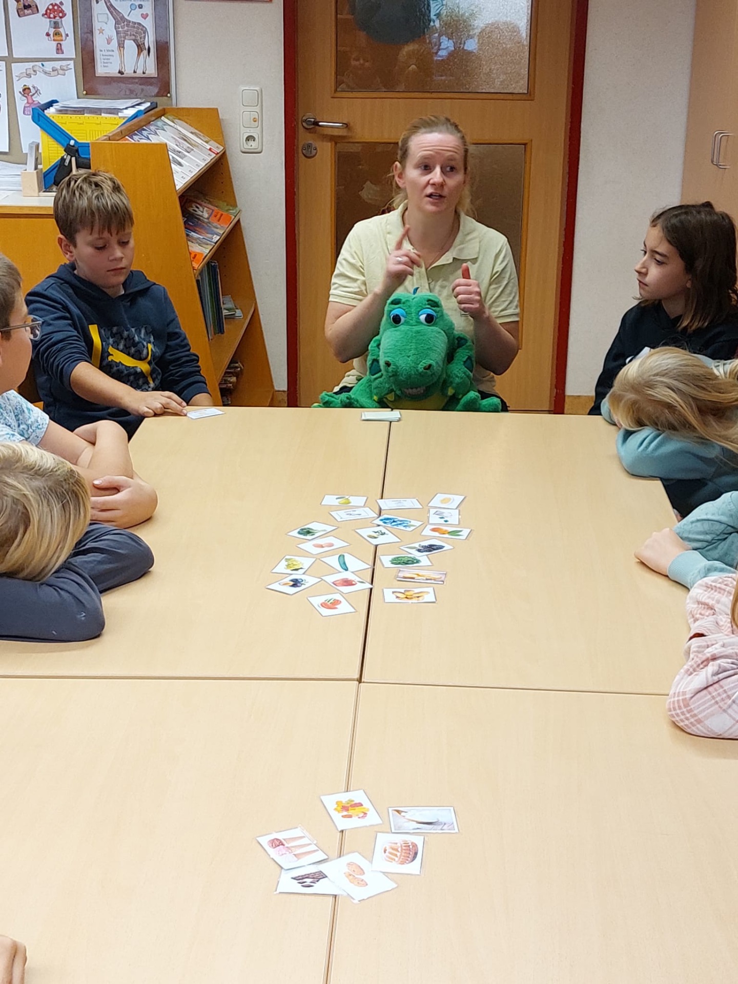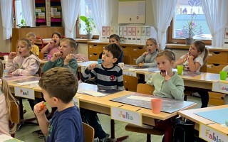 Der kleine Drache begleitet die Zahngesundheitserzieherin, Frau Manuela Bichlmayer, und versucht, den Schülerinnen und Schülern die Wichtigkeit der Zahnpflege klarzumachen.