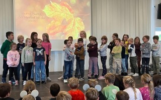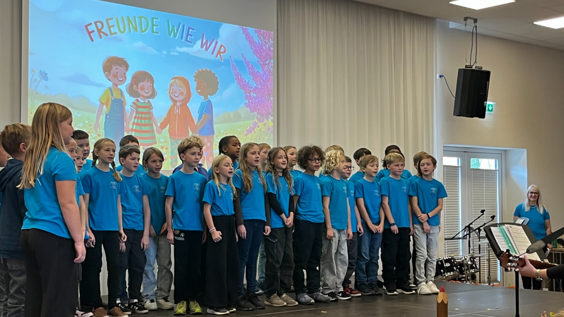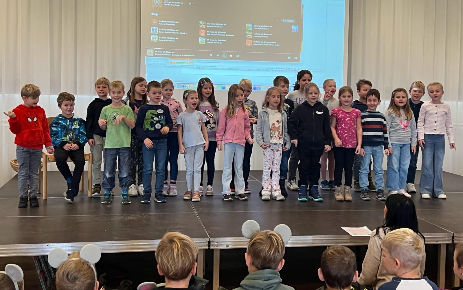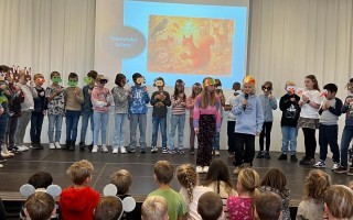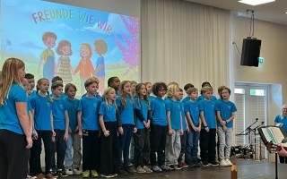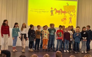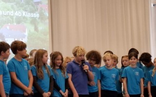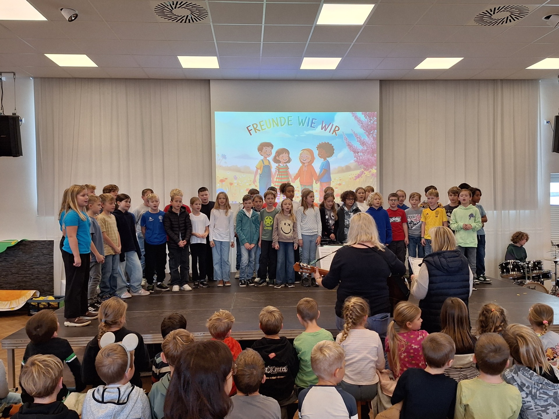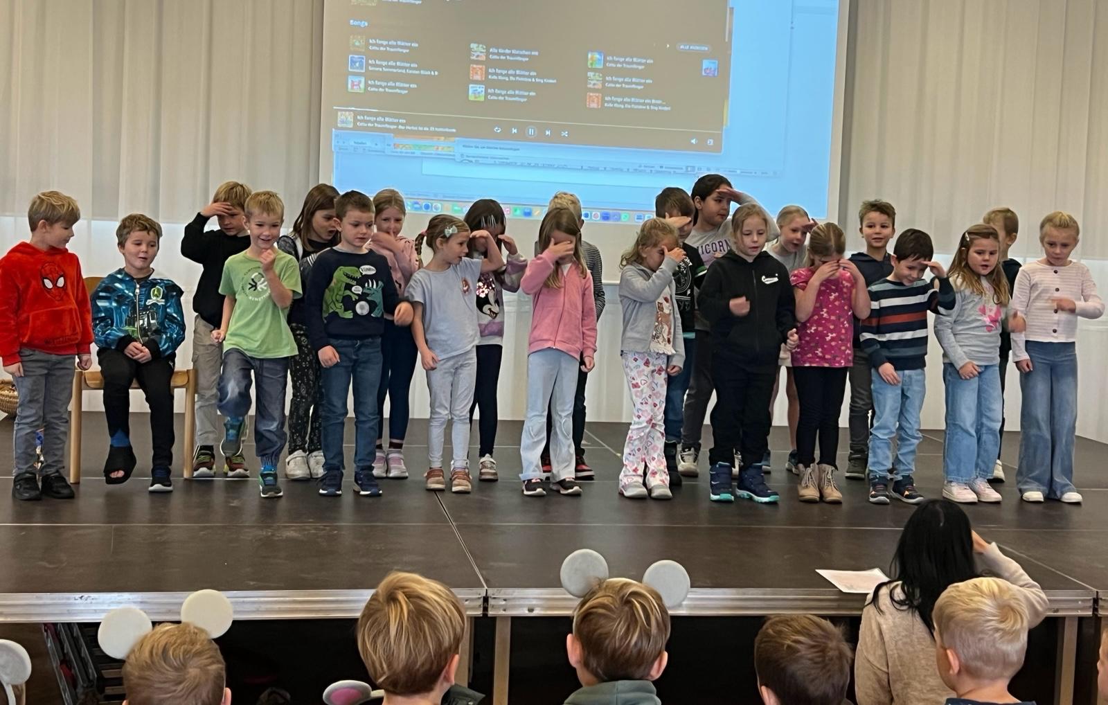 Bei den Liedern der gesamten Schulgemeinschaft sangen die Kinder sehr engagiert mit und bei den schwungvollen Liedern "Hakuna Matata" und "Freunde wie wir" strahlten die Gesichter der Sängerinnen und Sänger wie auch des Publikums.