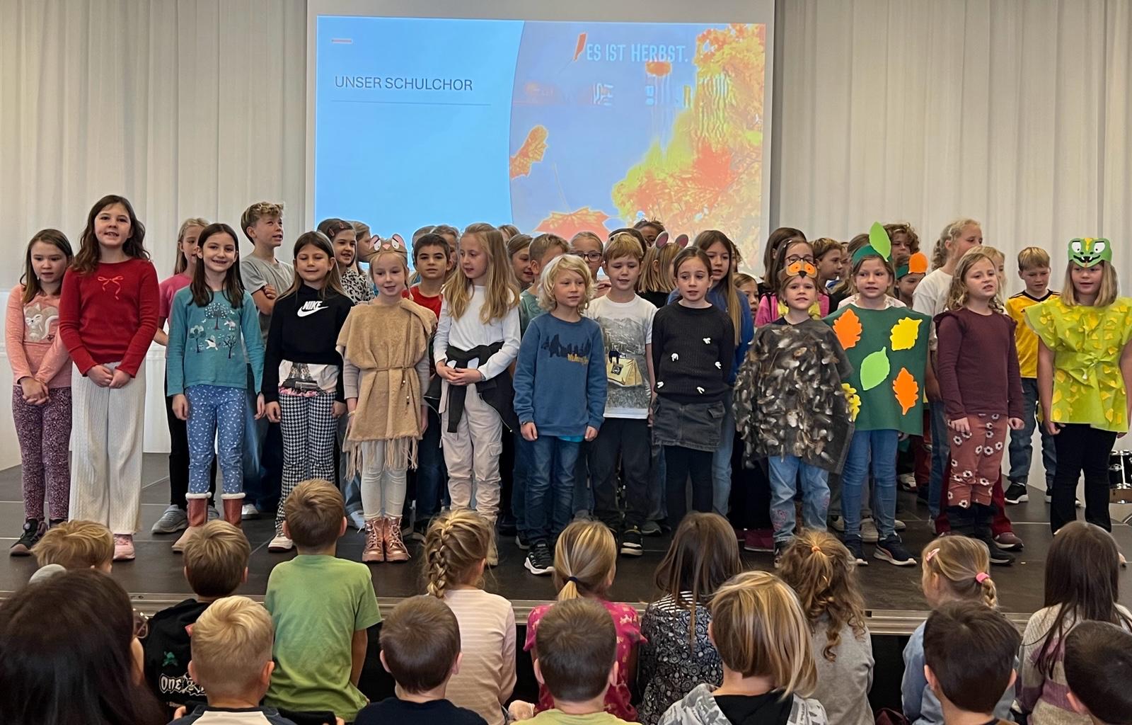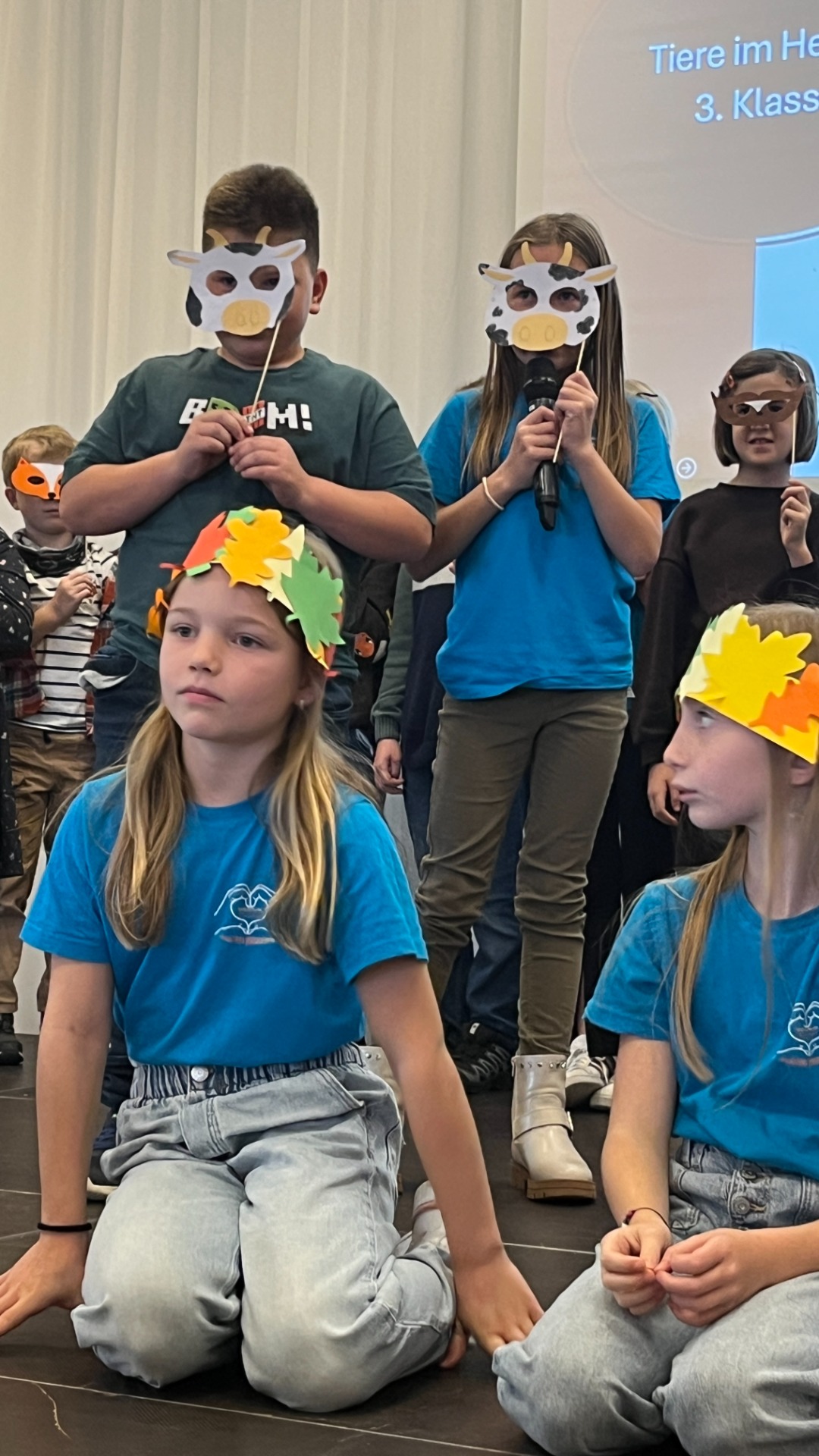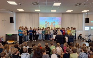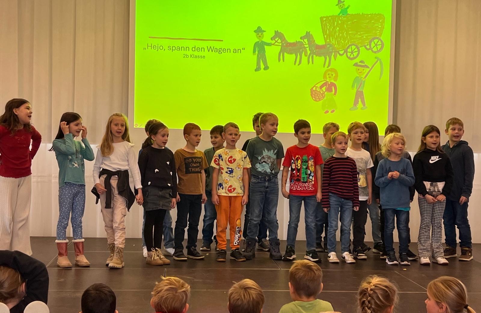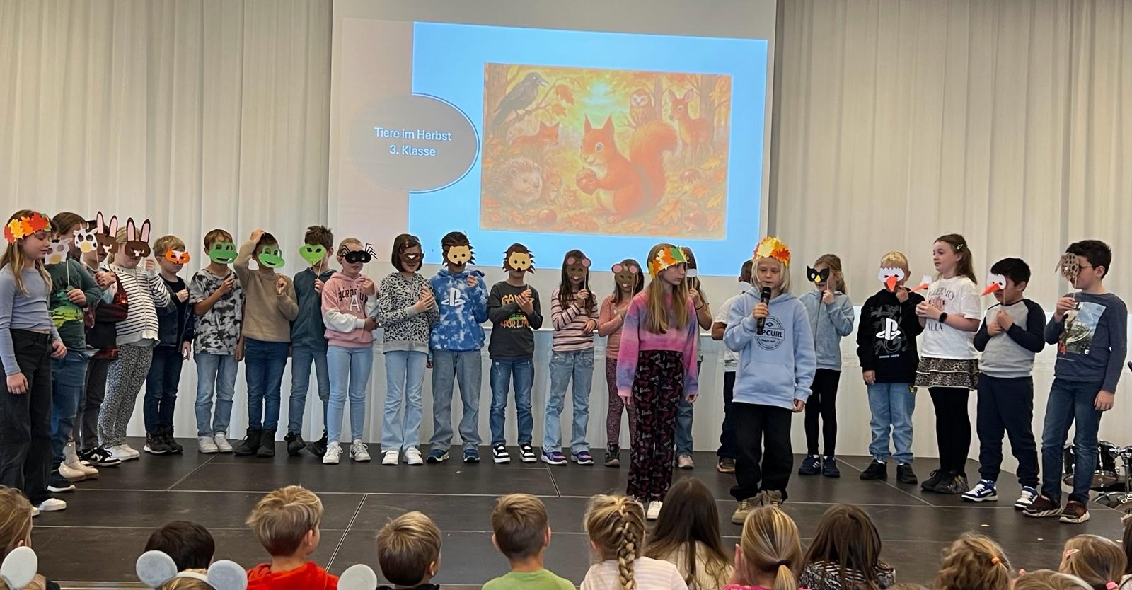 Bei den Liedern der gesamten Schulgemeinschaft sangen die Kinder sehr engagiert mit und bei den schwungvollen Liedern "Hakuna Matata" und "Freunde wie wir" strahlten die Gesichter der Sängerinnen und Sänger wie auch des Publikums.
