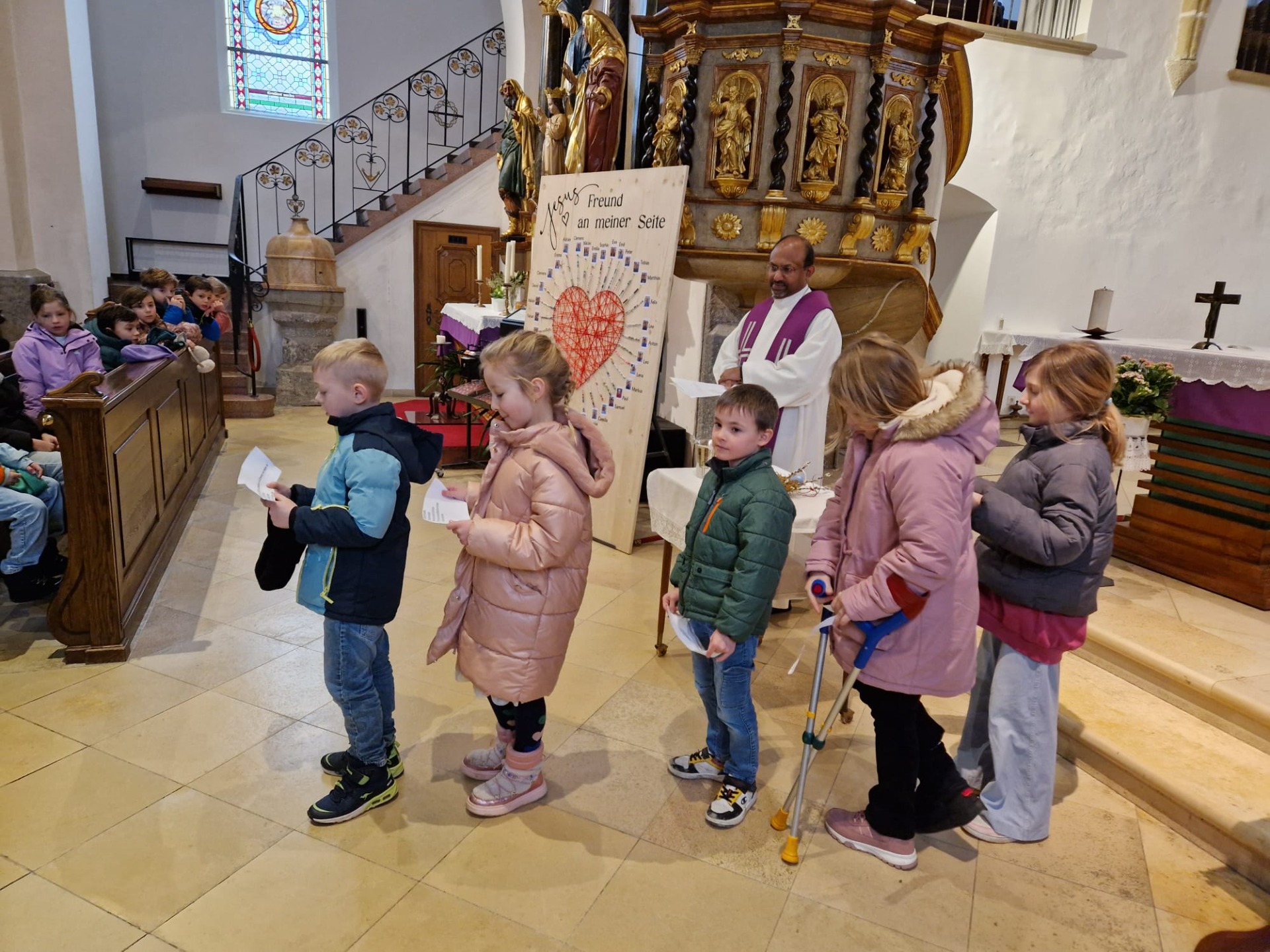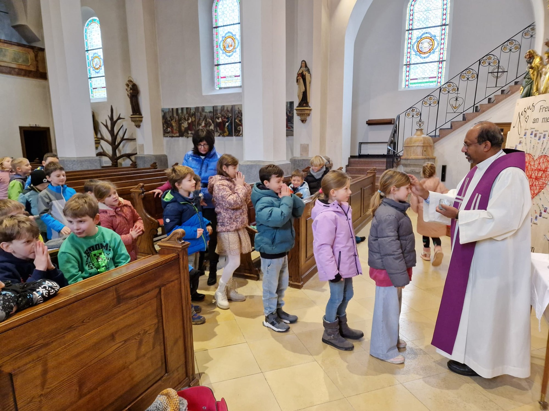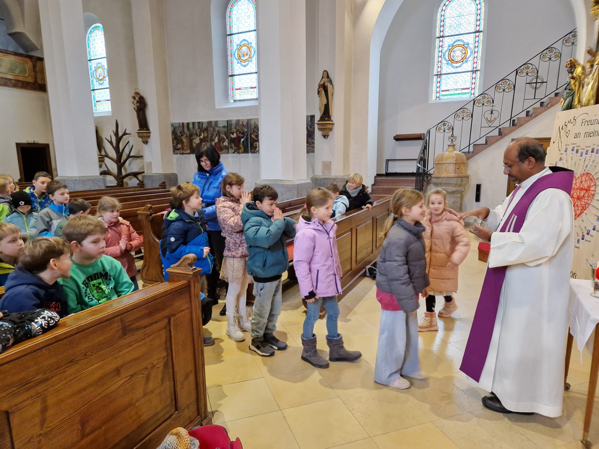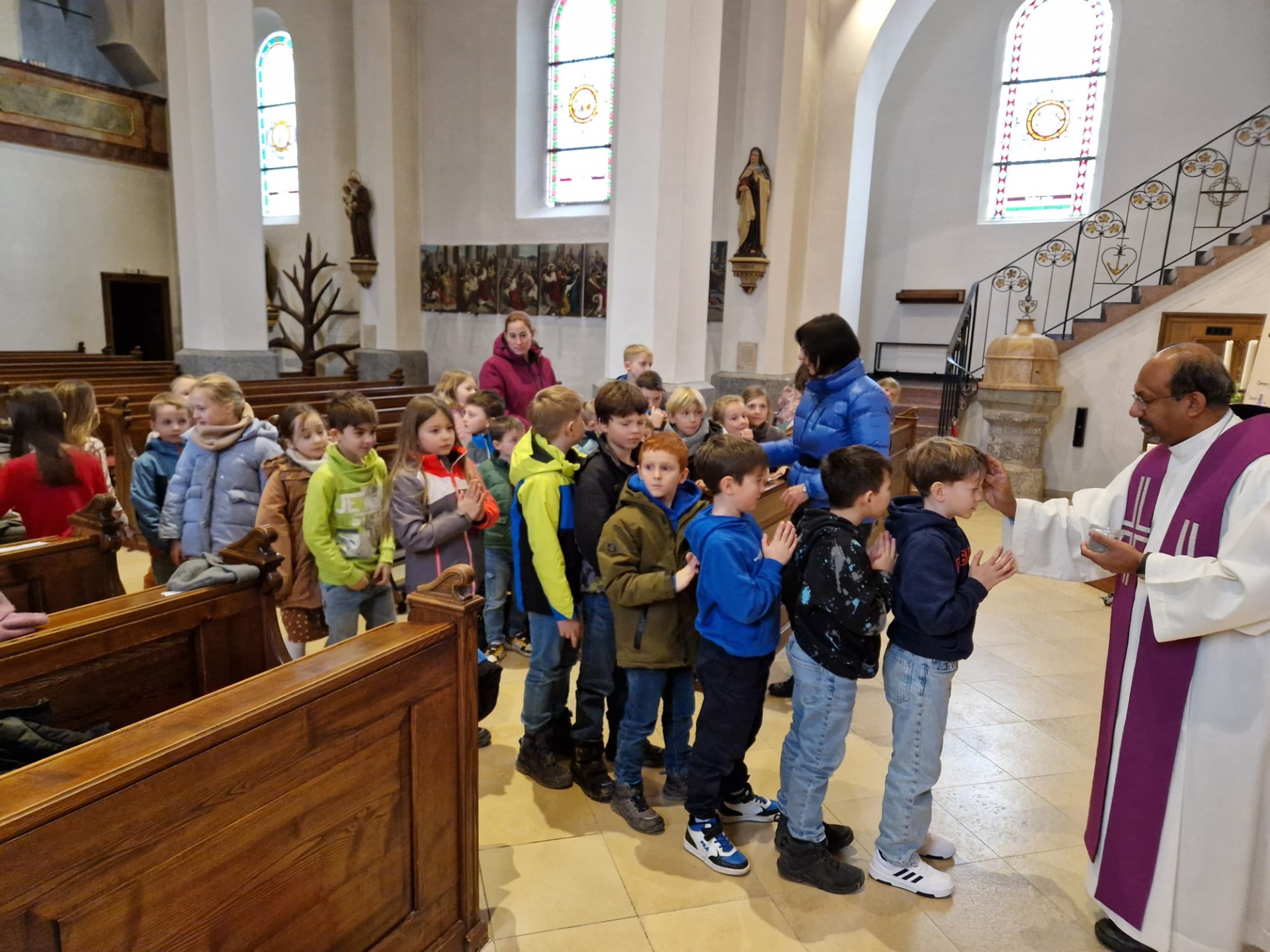 Frau RL Michaela Brandstetter, BEd, und Herr Pfarrer Wilson luden die Kinder der zweiten Klassen zur Spendung des Aschenkreuzes in die Kirche ein.