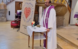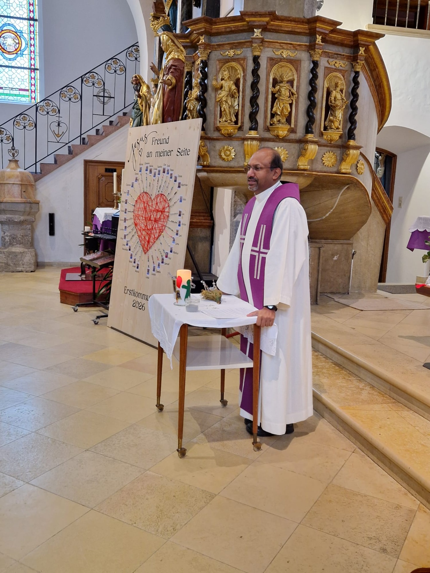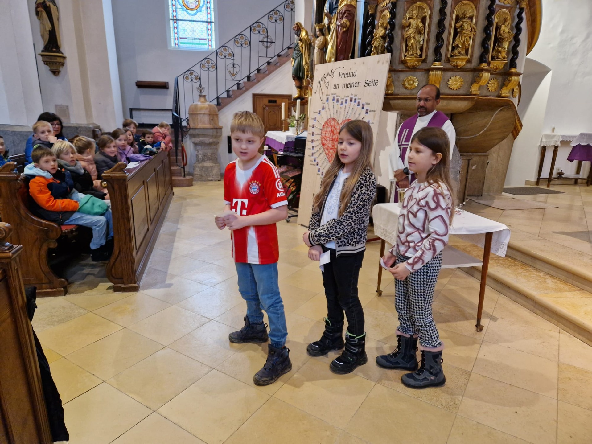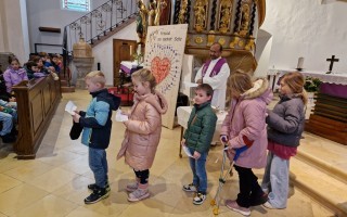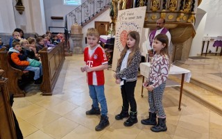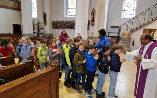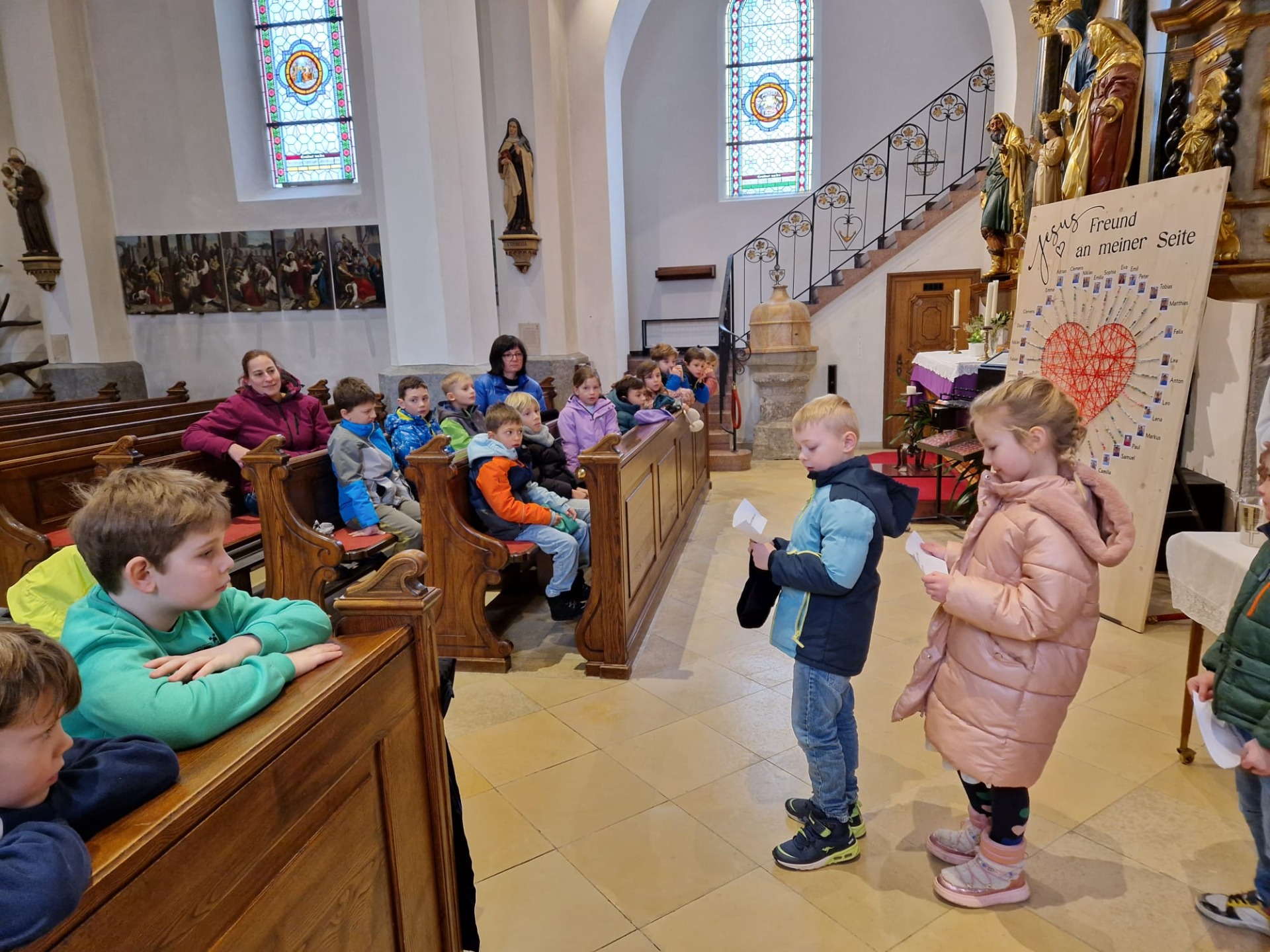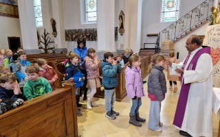 Frau RL Michaela Brandstetter, BEd, und Herr Pfarrer Wilson luden die Kinder der zweiten Klassen zur Spendung des Aschenkreuzes in die Kirche ein.